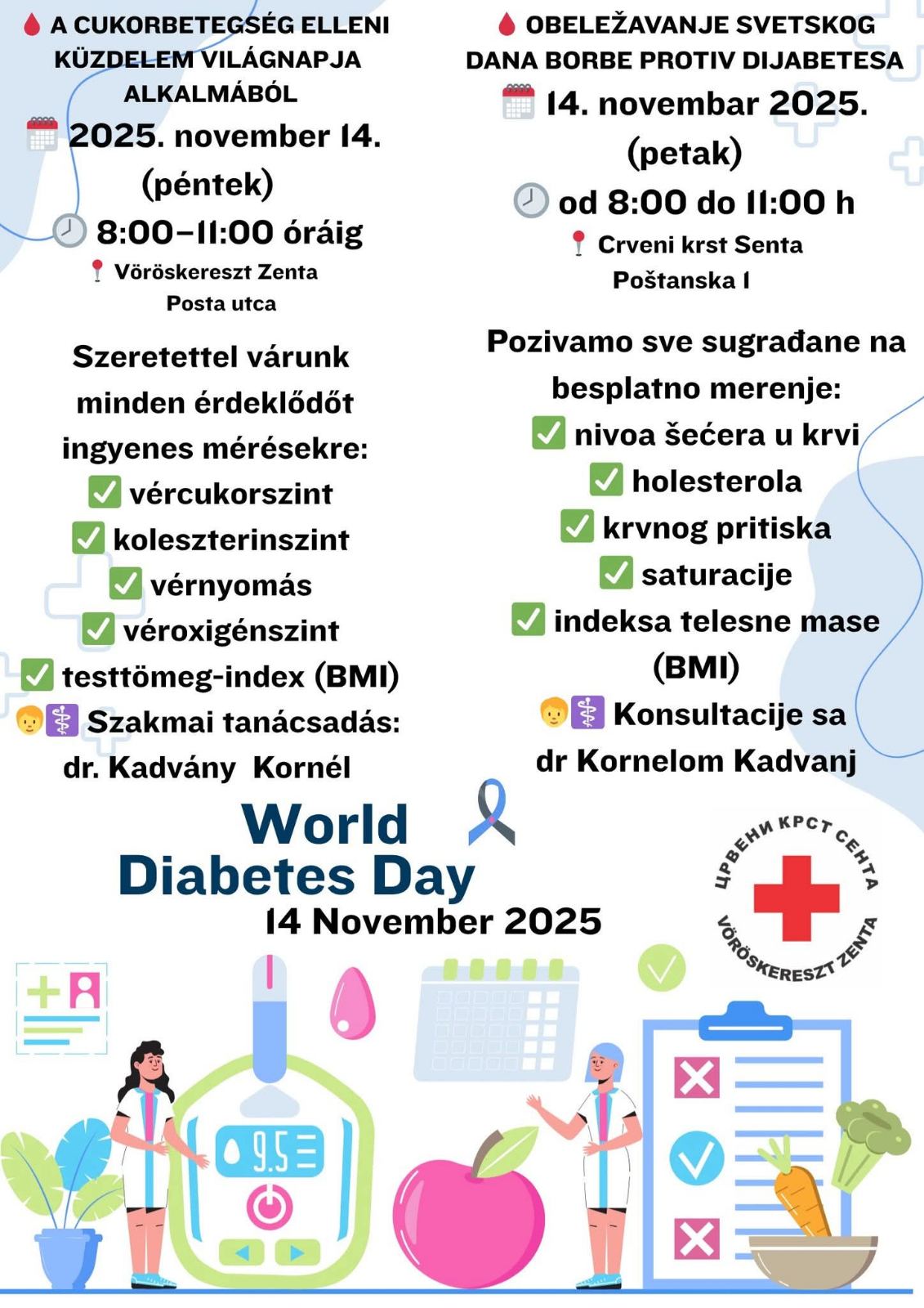 Povodom obeležavanja Svetskog dana borbe protiv dijabetesa Crveni Krst Senta, Dom zdravlja Senta i udruženje senćanskih diabetičara su organizovali bazar zdravlja.